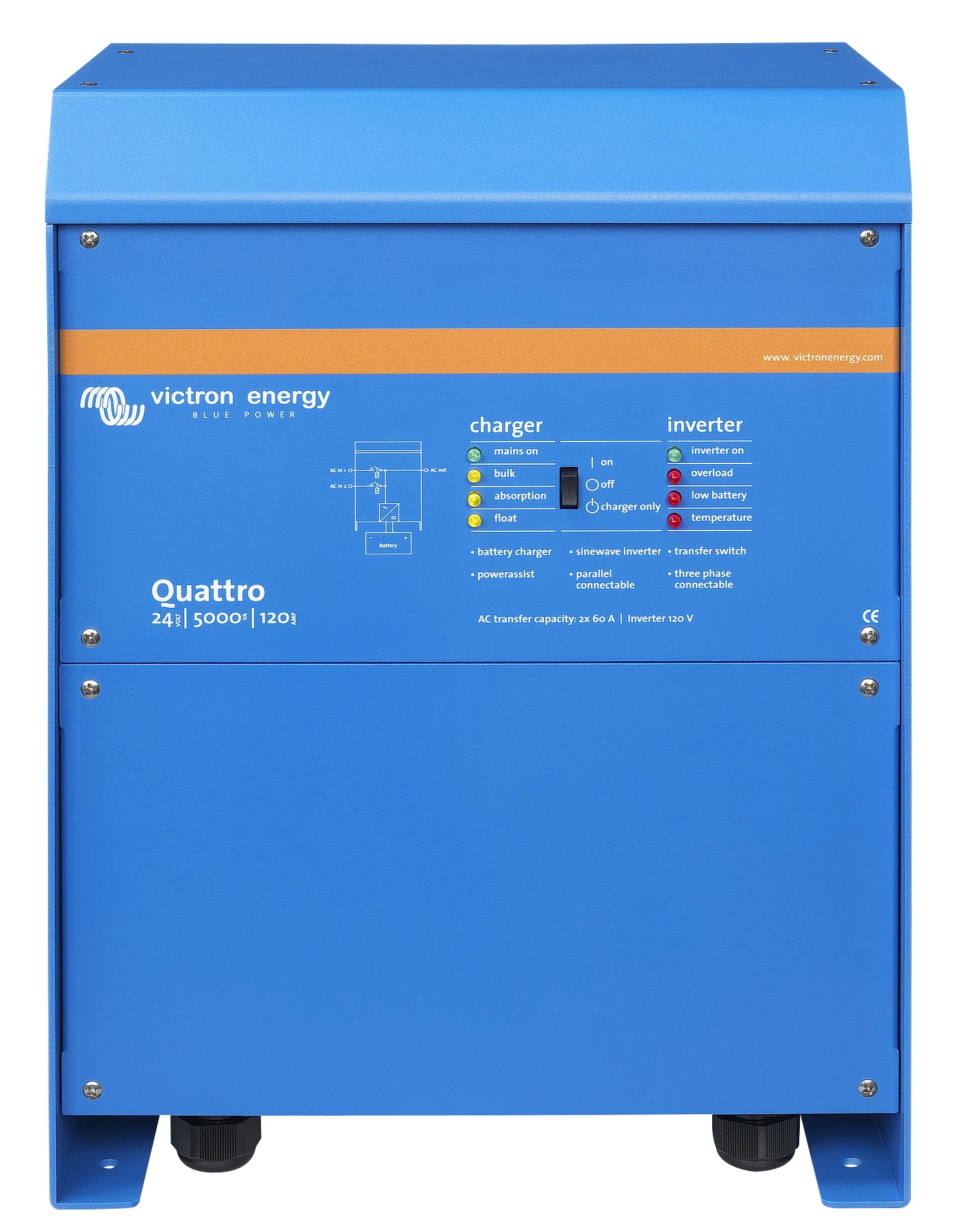 È possibile configurare tre unità per un’uscita trifase. Ma non è tutto: possono essere collegati in parallelo fino a 6 set di tre unità, per fornire 162 kW / 180kVA di potenza inverter e più di 2500 A di capacità di carica.